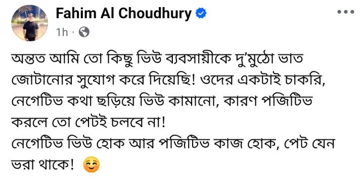 'অন্তত আমি তো কিছু ভিউ ব্যবসায়ীকে দু’মুঠো ভাত জোটানোর সুযোগ করে দিয়েছি! ওদের একটাই চাকরি, নেগেটিভ কথা ছড়িয়ে ভিউ কামানো, কারণ পজিটিভ করলে তো পেটই চলবে না!নেগেটিভ ভিউ হোক আর পজিটিভ কাজ হোক, পেট যেন ভরা থাকে!' এমন একটি আপত্তিকর পোষ্ট দেয়াকে কেন্দ্র করেই এমন সিন্ধান্তে আসে সকল সাংবাদিকরা।